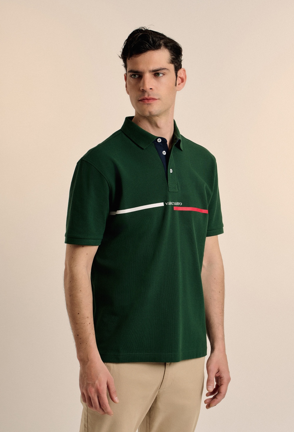 Polo color verde intenso confeccionado en 100% algodón piqué con logo bordado en pecho izquierdo. Cuello clásico y acabados acanalados. Cierre mediante tapeta de dos botones. Detalle de bandera en el pecho. Bajo con aberturas laterales.
