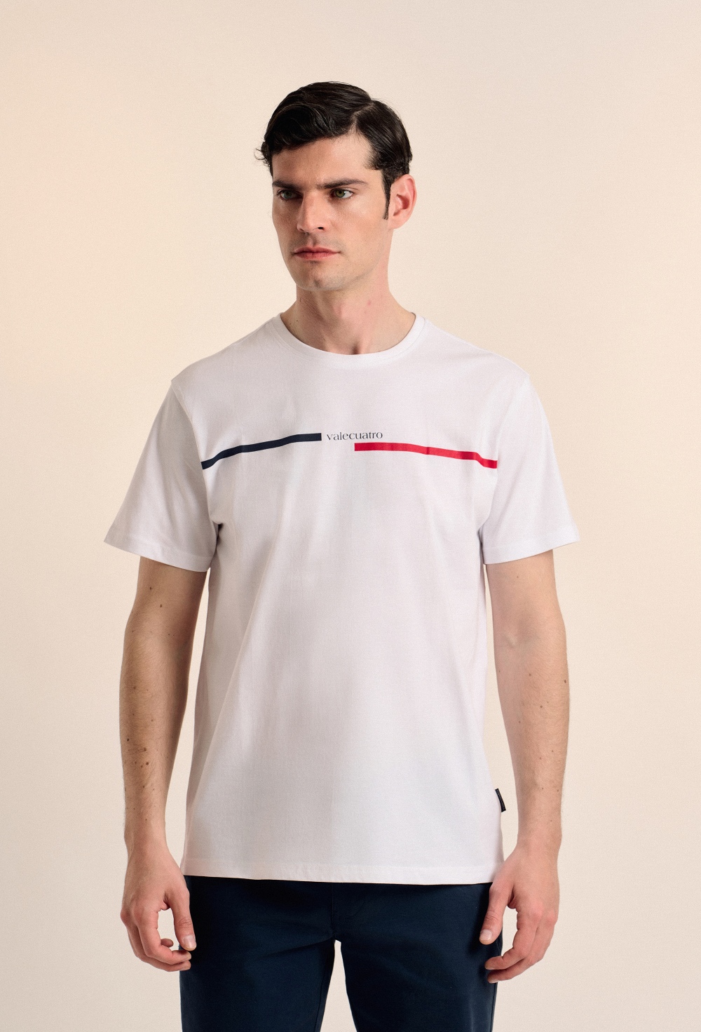 Camiseta blanca de algodón regular fit con serigrafía en el pecho. Cuello redondo y manga corta.
