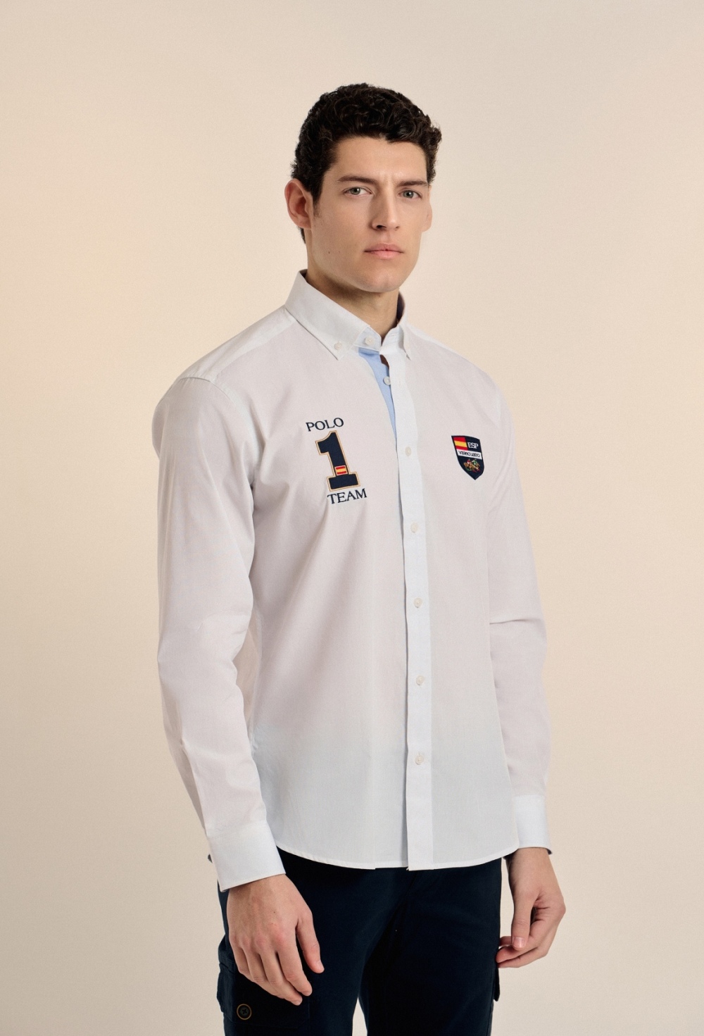 Camisa sport color blanco, en algodón popelín, con cuello abotonado y detalles bordados en pecho y espalda. Tapeta central con botones blancos personalizados. Esta camisa se caracteriza por los diferentes bordados.